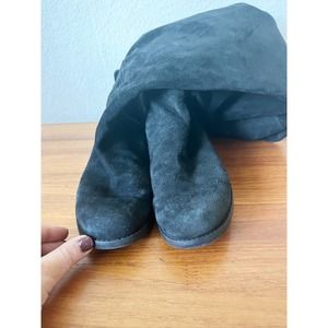 Over the knee boots that hit mid thigh. Suede leather. Light wear on toe. Inner zipper to put on.