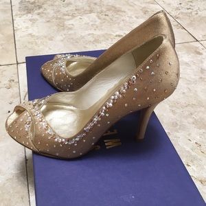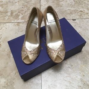 Stuart Weitzman Hotspots Gold Shimmer Satin Heels with Swarovski Rhinestones in Sz 4.5. Lightly worn 2x. They were too small and killed me but I wore them for a modeling event and a dinner. No signs of wear except the bottom from walking to the car and around the event and back to the car. Comes in original box w original packaging!