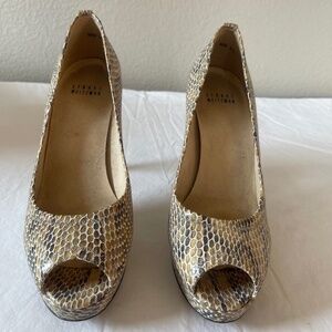 Stuart Weitzman JUST SO Beige Snakeskin Peep Toe Platform Stiletto Pumps Sz 8 M