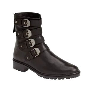 Stuart Weitzman Jitterbug Boot Leather Moto Four Buckle Black Round Toe Ankl 8