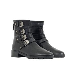 Stuart Weitzman Jitterbug Boot Leather Moto Four Buckle Black Round Toe Ankl 8