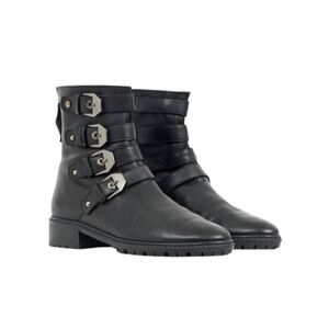 Stuart Weitzman Jitterbug Boot is a black leather ankle boot with four buckle closures. It has a round toe and features a moto-style design. The boot is in size 8 and is designed for women. Perfect for adding a touch of edgy style to your outfit.