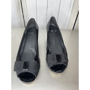 Stuart Weitzman Kitten Bow Heels Shoes 9.5M Patent Leather Pumps Peep Toe