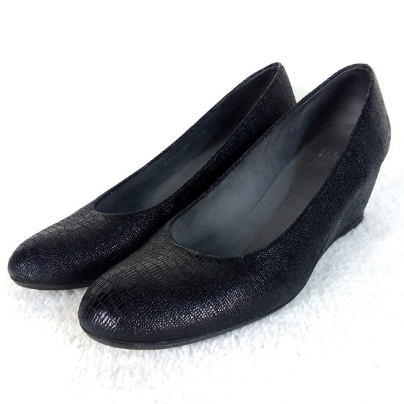 Keywords: Stuart Weitzman, wedge shoes, black heels, textured shoes, pointed toe, classic, workwear, dressy, evening, sophisticated, comfortable, elegant