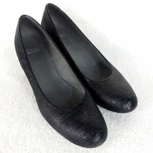 Stuart Weitzman Laidback Nero Lizette wedge heels in black with a textured finish. These elegant pumps offer a sophisticated silhouette with a comfortable wedge heel. Perfect for adding a polished touch to your work attire or for a chic evening out.