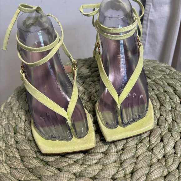Stuart Weitzman Lalita 75 Neon Green Suede Square Toe Lace Up Heel Thong Sandals