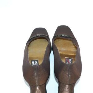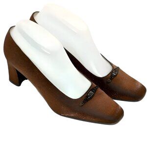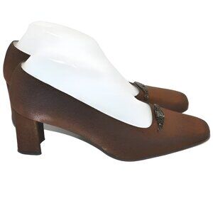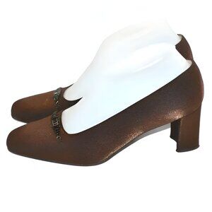 Offered is this lovely pair of Stuart Weitzman Lamé foil metallic brow-copper satin over genuine leather pumps, embellished with a delicate bronzed medallion. The shoes are in gently pre-owned condition & free from blemishes.