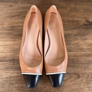 Stuart Weitzman Leather Flats – Size 7.5. These timeless tan and black leather flats exude classic elegance with their sleek two-tone design. Crafted with the quality and sophistication Stuart Weitzman is known for, they’re perfect for both work and everyday wear. Excellent used condition with minimal wear; a small imperfection on the inside of the sole does not impact the look or function of the shoe. A chic, versatile staple that will elevate any wardrobe.