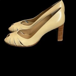 peep toe pump has cone heel. Side cut out at the front of the shoe. Block cone heel.