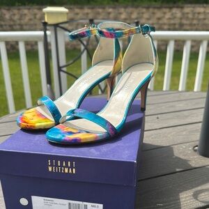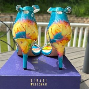 Stuart Weitzman Leather Patent Blue Yellow Pink Heeled Sandal Ankle Strap Size 8