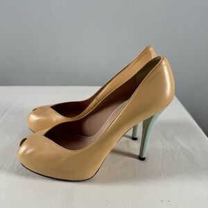Stuart Weitzman Leather Peep Toe Stiletto Heel Pump in Tan and Blue Size 8.5