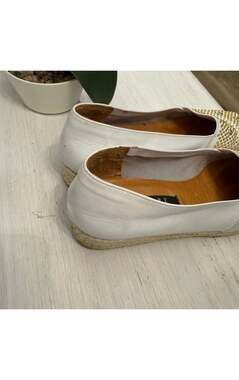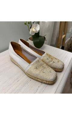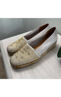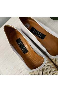 Step out in style with these chic Stuart Weitzman white leather wedges. These espadrille-style shoes feature an eye-catching design with all-over gold-tone studs and sparkling rhinestones on the toe. The comfortable wedge heel makes them perfect for extended wear, while the premium leather ensures durability and a luxurious feel. These shoes are in excellent pre-owned condition, showing minimal signs of wear and are ready to enhance your wardrobe. Ideal for adding a touch of glamour to any casual or semi-formal outfit.