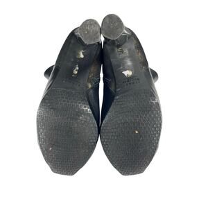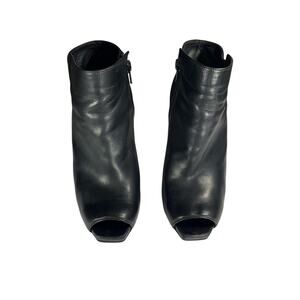 Stuart Weitzman peep-toe ankle boots. These black leather boots feature a side zipper, a metallic gold accent.