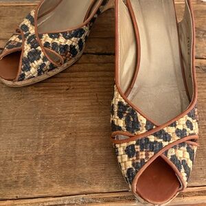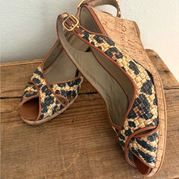Step out in style with these chic leopard print wedge sandals. Super cute peekaboo toe with light brown piping trim. Straw like texture. These cork wedges will slay hearts ๐