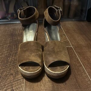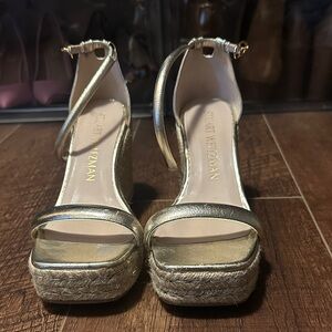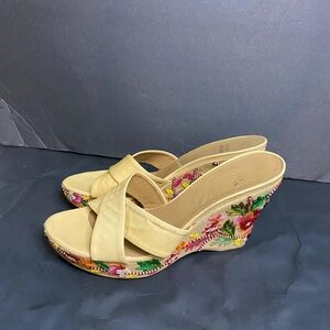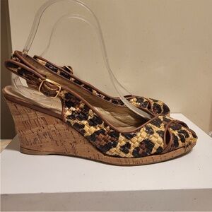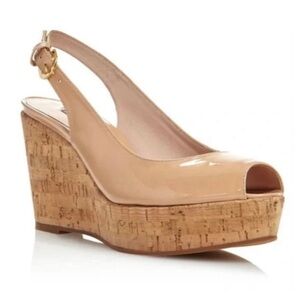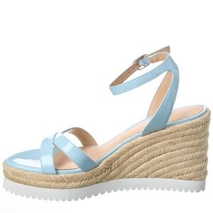 Elegant light blue wedges with a glossy finish. Features a comfortable ankle strap and woven platform.