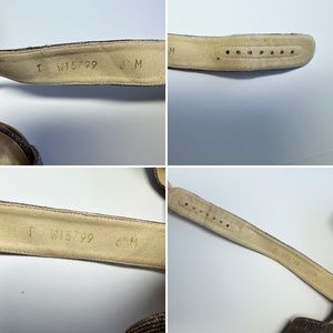 Pre-owned condition. Light wear to soles, light wear to insoles, light wear to fabric uppers, light wear to buckles and the edges of the fabric material behind the buckles, left shoe has excess glue on the outer side of the cork wedge, left shoe has wear on the edge of the toe strap, left shoe has wear on the edge of the adjustable strap, wear on underside of adjustable straps (reddish mark on left strap underside)