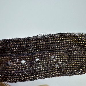 Sparkle / shimmery metallic fabric upper, crossover straps & buckle closure at ankles
