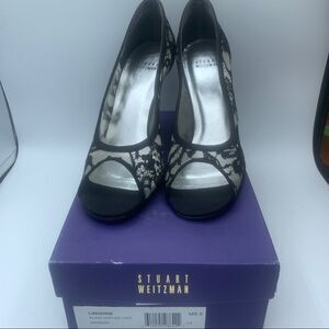 Stuart Weitzman Lingerie Black Guipure Lace Heels in sz 8.5. Minimal signs of wear only worn twice. Comes in original box with original packaging ! Flaw alert: heel has some separation of fabric.
