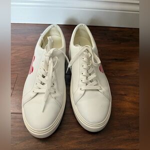 Seemingly Brand New, but these are lightly used white leather sneakers with red hearts on the exterior outside foot of each shoe. The only real apparent wear is the color of the bottom of the shoes. There are no scratches, scuffs on the shoes. Very good condition and comes from a smoke free home. Perfect for casual wear or making a statement!