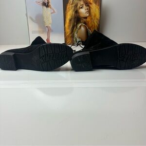 These sleek black over-the-knee boots by Stuart Weitzman feature a tall shaft that extends well above the knee, a rounded toe shape, and a comfortable low flat heel. Designed for a slim fit, they hug the leg closely and are perfect for pairing with various outfits.