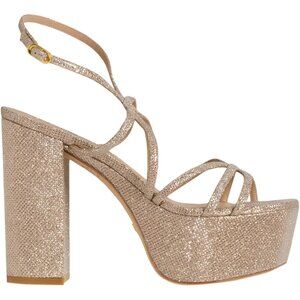 Step out in chic style with Stuart Weitzman's BarelyThere SQHI platform sandals, featuring metallic fabric straps, a platform design and a bold block heel.