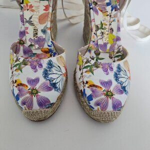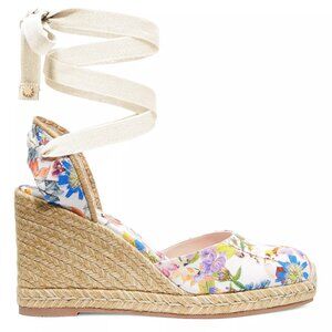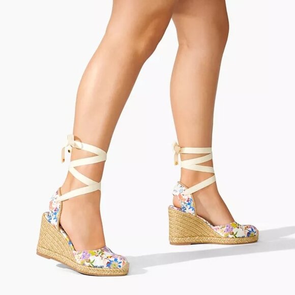 Beautiful espadrille wedge in floral printed twill with wraparound ankle ribbons and signature SW accents. An easy, classic summer style.