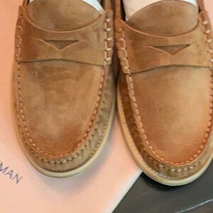 Stylish brown suede slip-ons by Stuart Weitzman. Perfect blend of comfort and elegance.