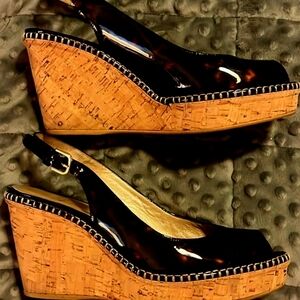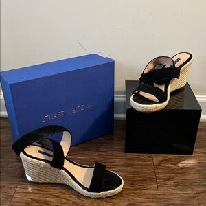 Chic metallic gold wedges by Stuart Weitzman. Features elegant straps and a comfortable woven heel.