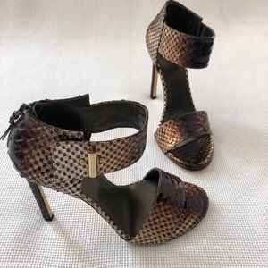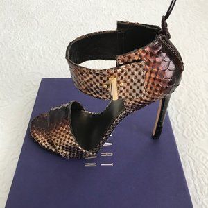 Stuart Weitzman Wine Glazed Python Brown and Gold pumps with ankle strap & buckle. 100mm heel in original box. Very Good condition. Only worn once for a photo shoot. Small marks are present on soles, please see pictures thoroughly before purchasing. Thank You!