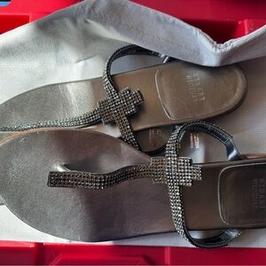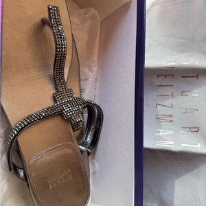Chic Stuart Weitzman sandals featuring a metallic finish. Adorned with sparkling rhinestones for a glamorous look.