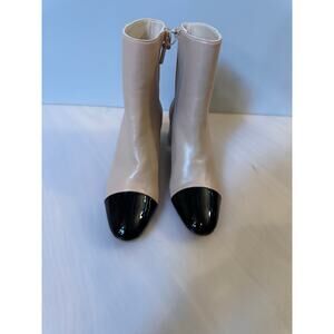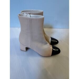 Step out in style with these classic Stuart Weitzman Milla ankle boots! Crafted from soft beige leather with a chic black patent leather cap toe, these booties offer a sophisticated touch to any outfit.