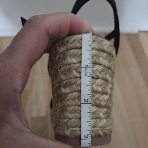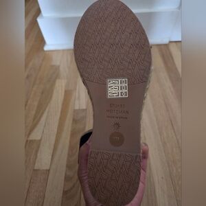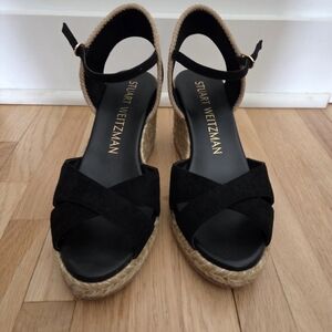 Stylish Stuart Weitzman Mirella espadrille wedges with black straps and tan sole. 3" heel.