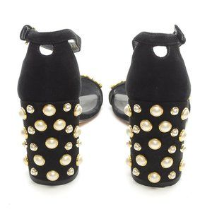 Stuart Weitzman Morepearls pear studded, single band, ankle strap sandals in black suede.