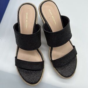 Stuart Weitzman Mykonos Two-Strap Wedge Sandals Herringbone Raffia & Black 38.5