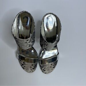 Silver and snakeskin heeled mule sandals