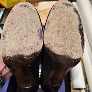 Adorable Black Suede low heels - about 2 inches. The shoes are worn. So comfortable to walk in so bottoms show wear. Overall in very good shape with no exterior flaws. slight toe impressions in the peep toe area but will look new on your feet. Size 7. in the original box. $220 shoes originally form Nordstrom. labeled NUINVITED 6W28715 7.0M size. Box is still in very good shape