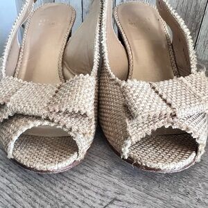 Could there be a more perfect everyday heel for the summer? The material is like a jute/sisal. These are in fantastic condition with the only wear showing on the bottoms. The toes and fabric look great. A lower style block heel for all day wear. Size 8
