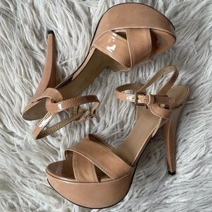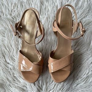 Stuart Weitzman Nexus Open Toe Patent Leather Nude Platform Heeled Sandals Sz 9