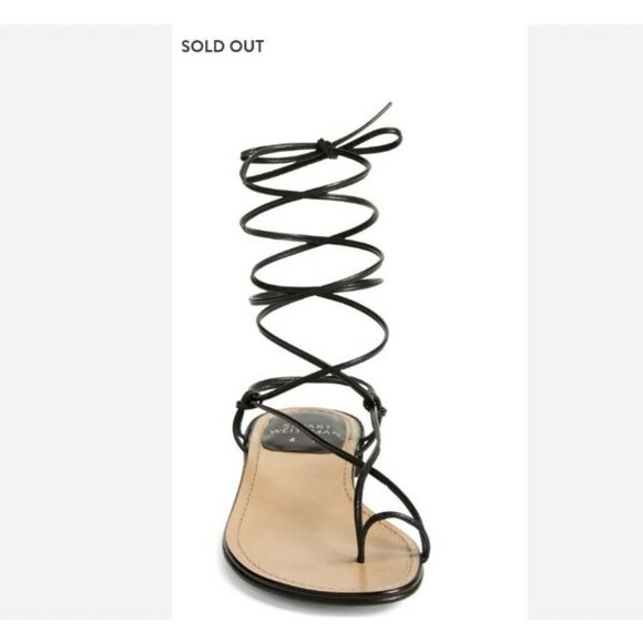 Details: Open toe design, flat profile, wraparound ankle laces, stitched footbed edge, Stuart Weitzman branding on insole and outsole.