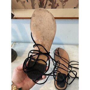 Style: Womens flat lace up sandals with thin black wraparound straps and tan footbeds.