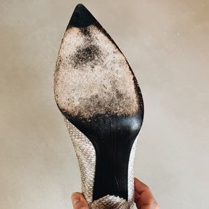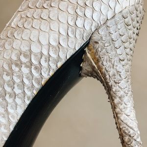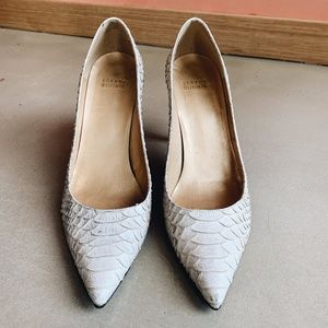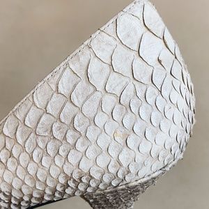 Stuart Weitzman "Nouveau" grey and white python pump with 95mm (4 in.) stiletto heel and pointed toe. Color of the python finish ranges from white to cream to taupe to medium grey. Good condition with little wear, some slight discoloration in a couple of spots (see last photos). They appear to be labeled size 9 on the inside, however I'm a 9.5/10 and can wear them, so I'm listing them as a 9.5.