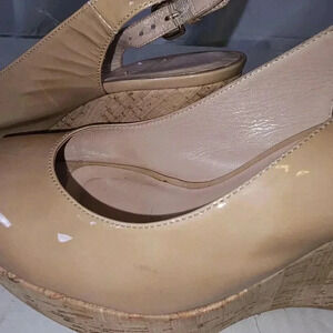 Stuart Weitzman Nude Patent Leather Cork Wedges Sz 8.5 M