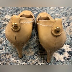 Stuart Weitzman Nude Patent Pumps, size 6.5M, preowned condition, black mark on outer left shoe, crease on the right shoe, and a tan mark on the right shoe (see pic)
