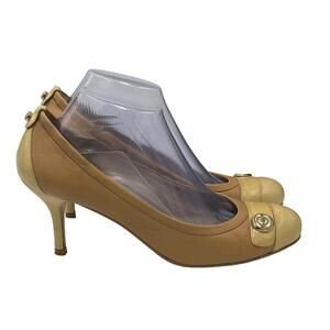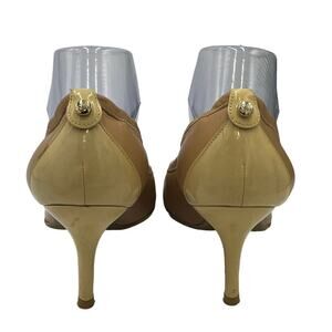 Stuart Weitzman Nude Tan Leather Patent Cap Toe Classic Heel Gold Accent Sz 9.5