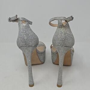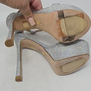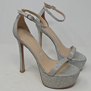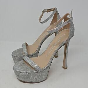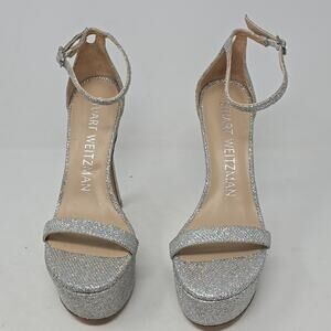 The Stuart Weitzman Nudircurve Hollywood Platform Heel Sandals in Women's Size 6 are a glamorous and stylish choice for any occasion. These silver platform sandals feature a synthetic upper material and a comfortable heel design, making them perfect for evening events or a night out on the town. The iconic Stuart Weitzman brand ensures quality and sophistication in this fashionable footwear option. Never worn Some sole stickers residue small stain on the back see pictures for reference