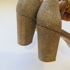 Elegant gold sandals with block heel. Features ankle strap with buckle closure. Perfect for any occasion.