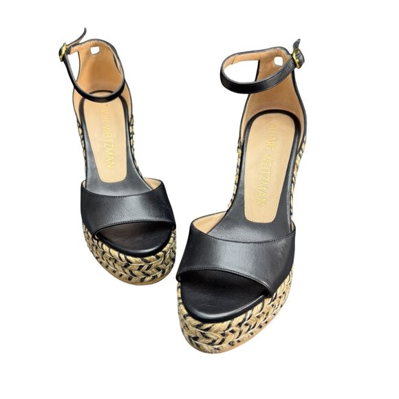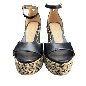 Stuart Weitzman Nudist Curve Espadrille Wedge Sandals Black Leather 7.5B WORN ONCE