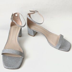 Stuart Weitzman Nudistcurve 35 Silver Block Heel Ankle Strap Sandals Pumps 10.5