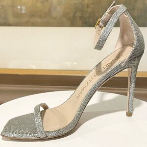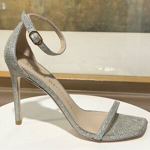 Elevate your look with these iconic Stuart Weitzman Nudistcurve Glitter Open Toe Sandals, brand new.