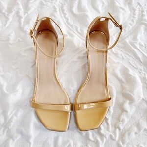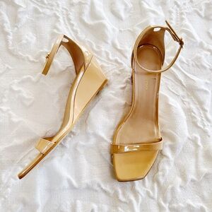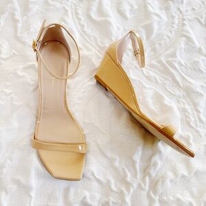 These sandals are in great like new condition No previous use slight residue at bottom sole from sticker price tag being removed Fits true to size Slender straps secure your foot in a wedge-lofted sandal done in a shimmery patent finish and made modern by a squared toe. 2" heel Adjustable ankle strap with buckle closure Leather upper and lining/synthetic sole Made in Spain Retail price $450.00